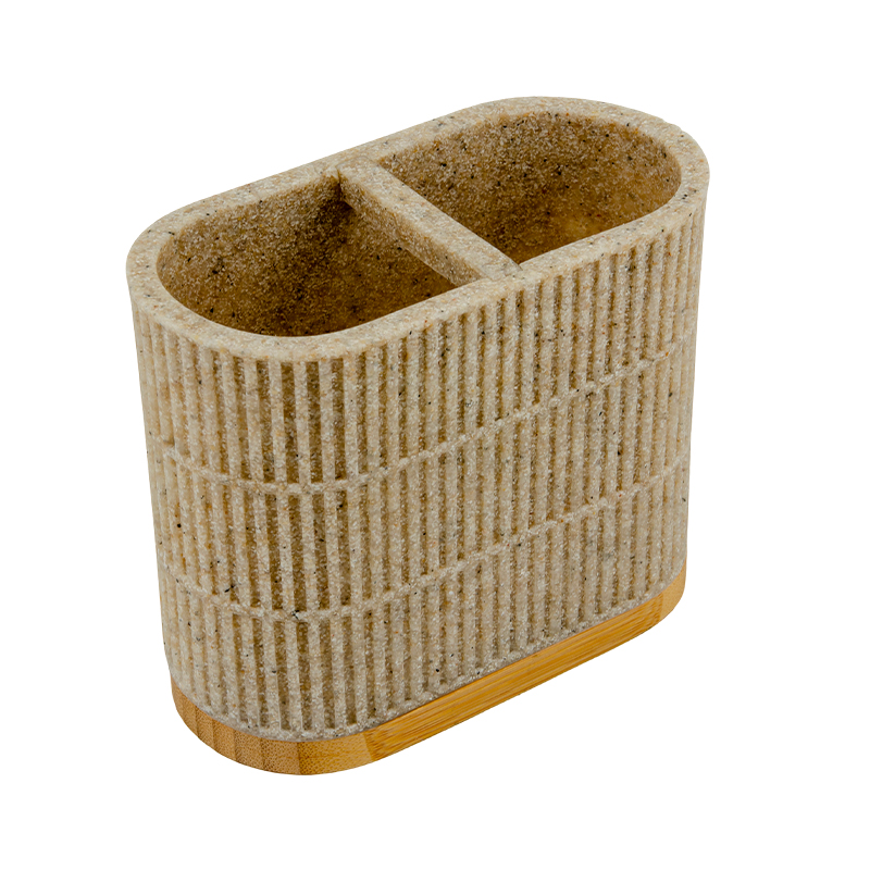 Organiza tu baño con estilo gracias a este porta cepillos de dos compartimentos. Fabricado en poliresina texturizada en tono beige con base de bambú, combina resistencia con un diseño moderno y cálido.