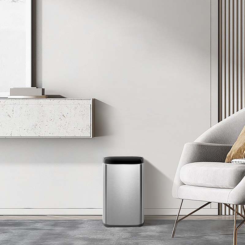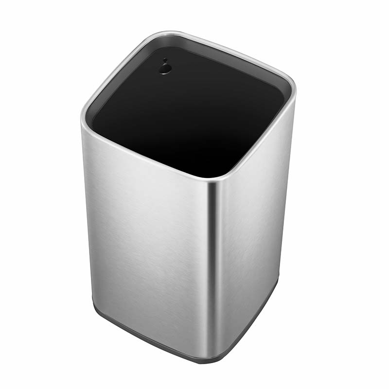 Equipado con revestimiento interior de plástico y revestimiento a prueba de huellas dactilares. Quitando la parte superior suelta, la bolsa de basura se puede cambiar fácilmente. Las tapas de goma en la parte inferior protegen y mantienen el contenedor de basura en su lugar.