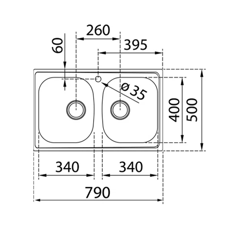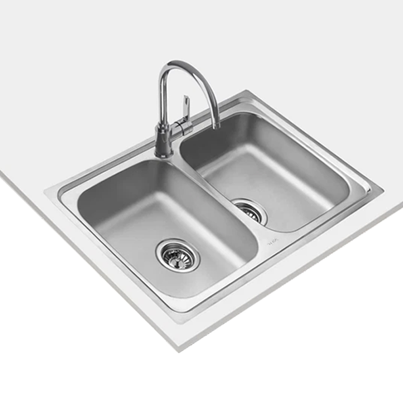 Fregadero de acero inoxidable con doble cubeta diseñado para instalación tipo “inset”, ideal para cocinas que requieren funcionalidad y estética. Incluye válvulas tipo cestilla y sistema de montaje discreto, ofreciendo un acabado elegante y práctico en el uso diario.