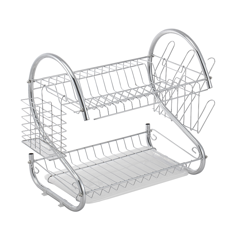 Escurridor de platos con diseño de doble nivel que optimiza el espacio en la cocina. Fabricado en metal cromado resistente, permite organizar platos, vasos y cubiertos de manera práctica y ordenada.