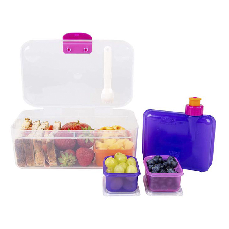 Contenedor rectangular de gran capacidad con tapa cuenta con 6 piezas, una de ellas incluye además una botella para llevar sus bebidas. Ideal para llevar su almuerzo y refrigerios, sin mezclar sabores.