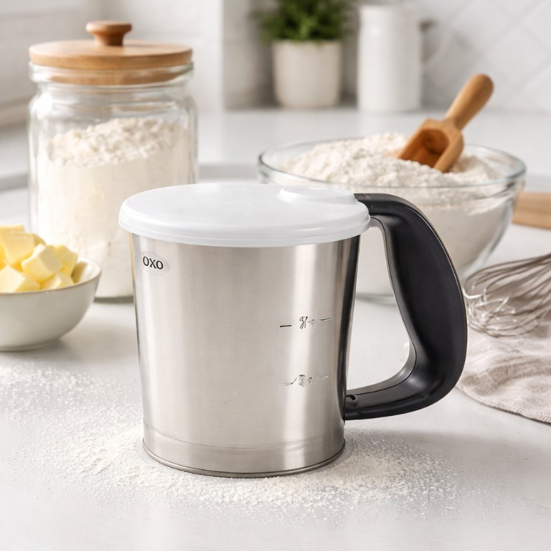 Fabricado con materiales resistentes y duraderos, el tamizador OXO combina funcionalidad, diseño moderno y calidad premium para acompañarte en cada creación culinaria.