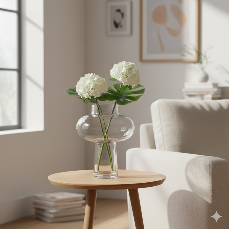 Florero de vidrio transparente con diseño moderno y base alargada que sostiene un cuerpo redondeado de gran elegancia. Su forma contemporánea lo convierte en una pieza ideal para realzar la belleza de arreglos florales o como elemento decorativo independiente en espacios minimalistas o modernos.