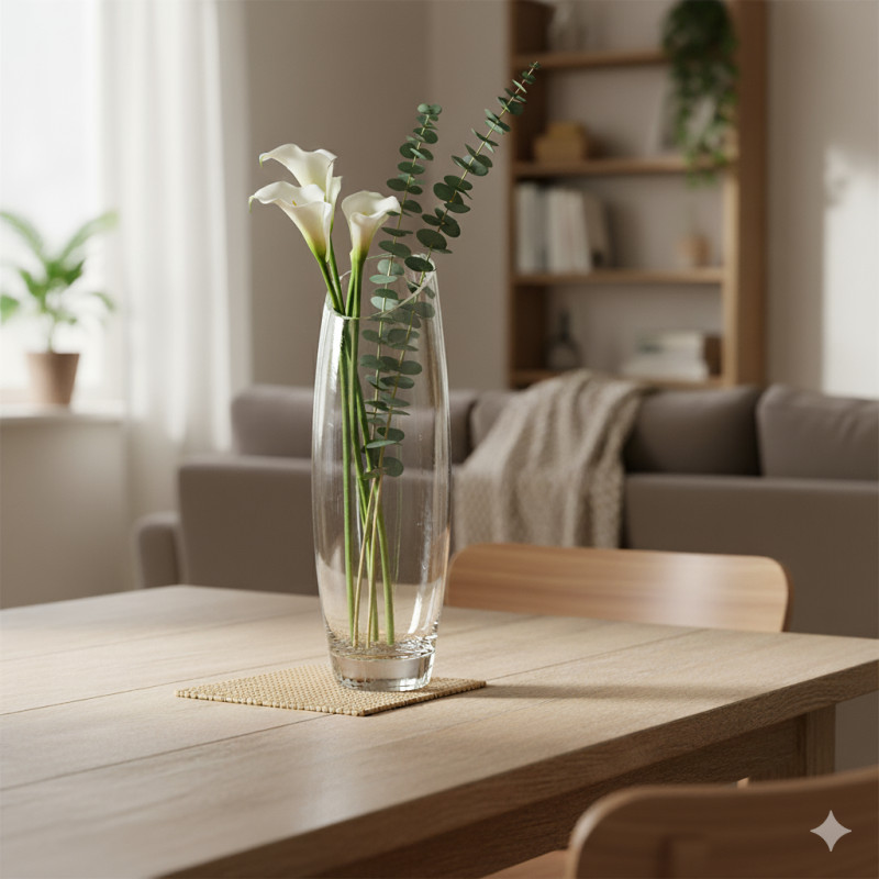 Elegante florero de vidrio transparente con diseño alargado y corte diagonal en la parte superior. Su forma estilizada realza la altura de los arreglos florales y aporta un toque moderno y sofisticado a cualquier ambiente. Ideal para decorar mesas, recibidores o espacios minimalistas.