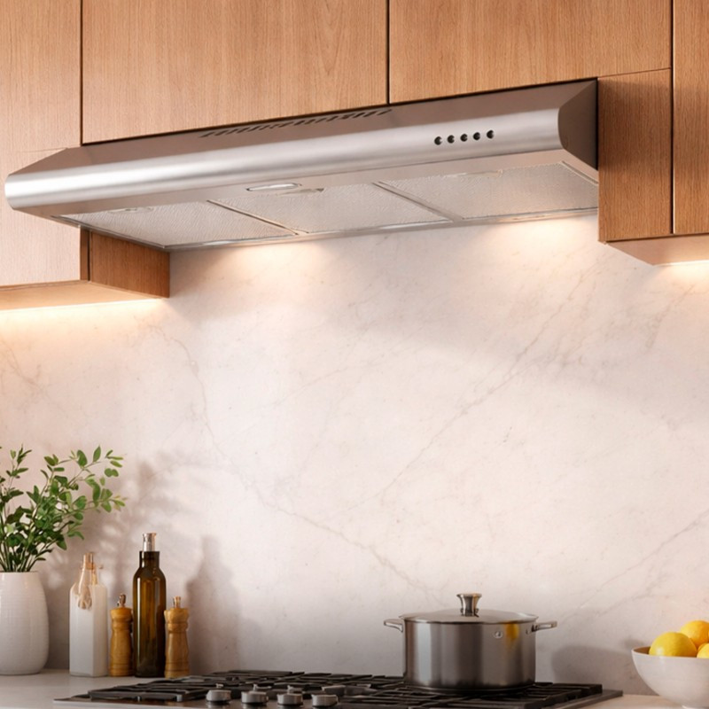 Mantén tu cocina libre de humo, grasa y olores con esta campana extractora en acabado acero inoxidable. Su diseño moderno y estilizado se integra perfectamente en cocinas contemporáneas, aportando funcionalidad y estética en un solo equipo.