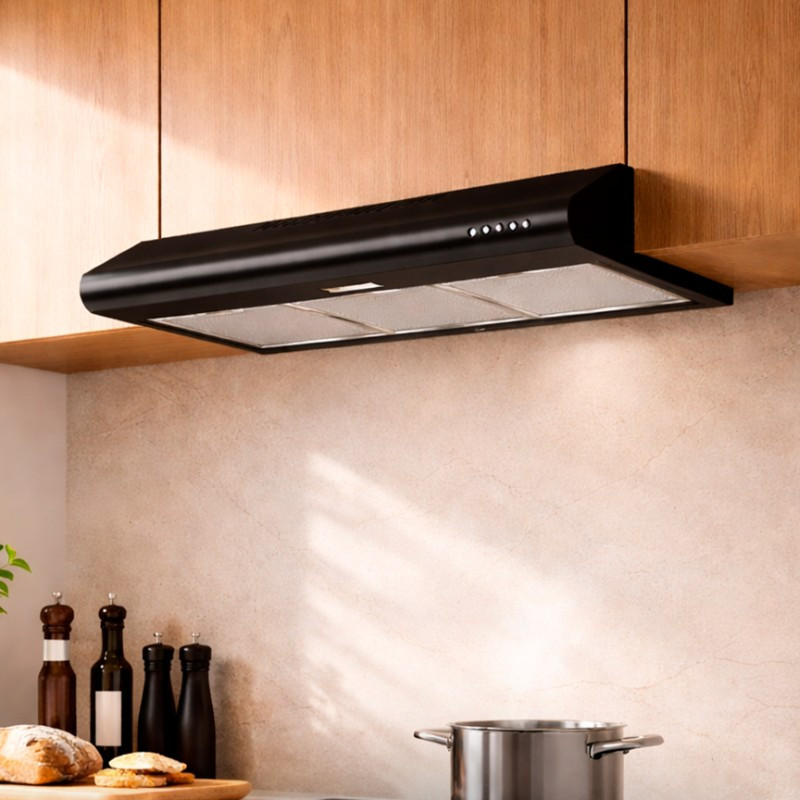 Mantén tu cocina libre de humo, grasa y olores con esta campana extractora en acabado negro mate. Su diseño moderno y estilizado se integra perfectamente en cocinas contemporáneas, aportando funcionalidad y estética en un solo equipo.