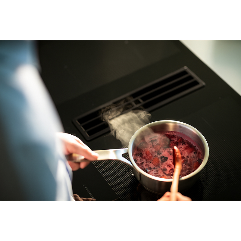 Con las placas de inducción de tiro descendente, la ventilación se acerca a la superficie de cocción, lo que resulta en una captura y eliminación más eficiente de los humos y olores de la cocina.