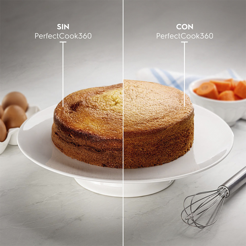 Tecnología que combina un horno con cavidad sellada y convección PerfectCook360 hornea hasta un 30%* más rápido y de manera uniforme. *Resultados obtenidos de pruebas internas. Convección: Hornea consistentemente gracias al ventilador interno que circula el aire caliente de manera uniforme, asegurando una temperatura homogénea dentro del horno. Cavidad Sellada: Permite un mejor aislamiento térmico en el interior de la cavidad a través de una estructura con esquinas redondas que retiene toda la temperatura en el interior del horno.