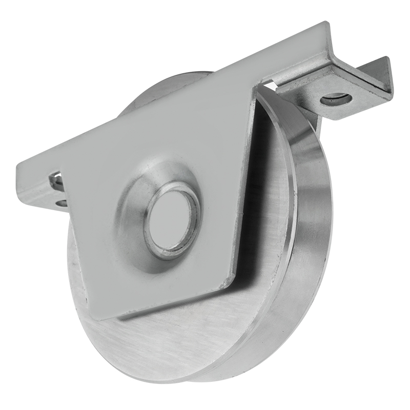 Rueda galvanizada en V con soporte interior para puerta de garaje.