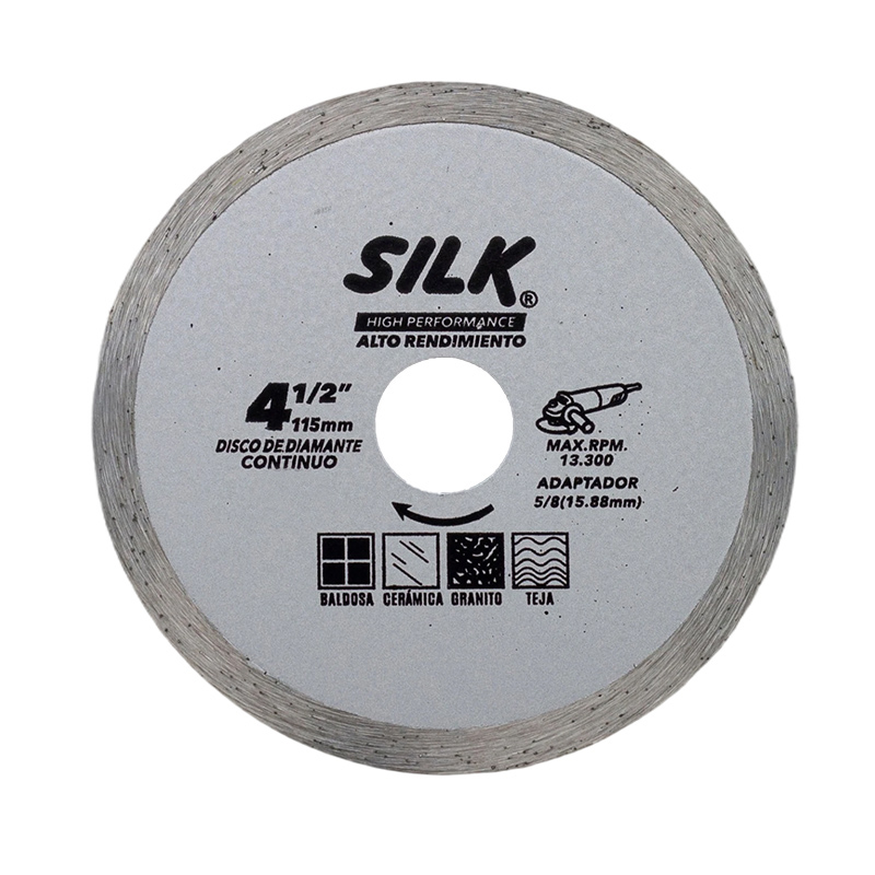 Disco de diamante SILK de 4 1/2 pulgadas (115 mm) con borde continuo está diseñado para ofrecer cortes limpios, precisos y de alta calidad en materiales cerámicos y de acabado. Gracias a su diseño de borde continuo, permite realizar cortes más suaves y con menor astillado, siendo ideal para trabajos donde se requiere mayor precisión y un acabado más fino.