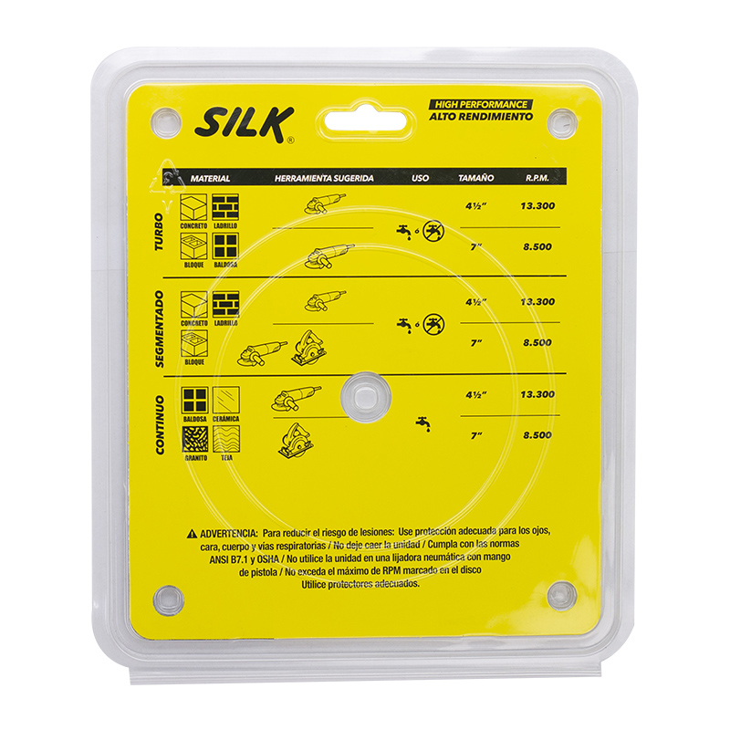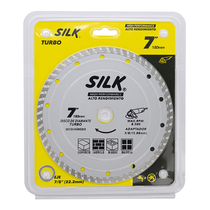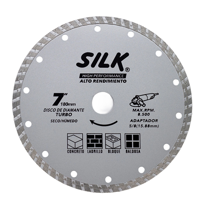 Disco de diamante SILK Turbo de 7 pulgadas (180 mm) está diseñado para ofrecer cortes rápidos, precisos y de alto rendimiento en materiales de construcción. Su diseño turbo permite una mejor evacuación del polvo y una mayor disipación del calor, lo que mejora la eficiencia del corte y prolonga la vida útil del disco.