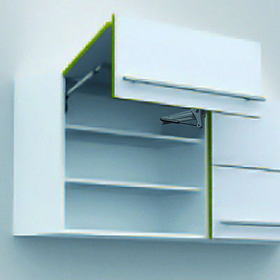Brazo para anaqueles colgantes muy elevados con frente dividido. Alto del mueble desde 520-720 mm, ancho del mueble 600-900 mm. Cierre suave y silencioso. Escasa fuerza necesaria para manipularlo, con bisagra plana incluida, para usar con bisagras.