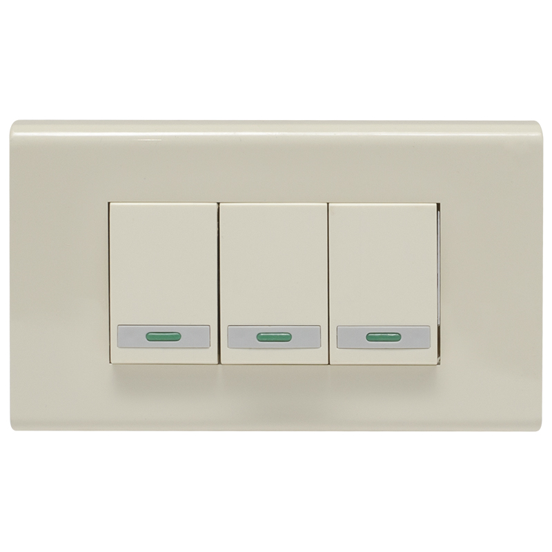 Interruptor triple con luz en cada botón que indica el encendido y apagado del interruptor, amperaje 10A.