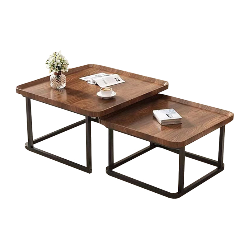 Este set de mesas de centro destaca por su diseño moderno y funcional, ideal para salas contemporáneas, industriales o minimalistas. Está compuesto por dos mesas cuadradas de diferentes tamaños que pueden utilizarse juntas o por separado, adaptándose fácilmente a distintos espacios y necesidades. Sus cubiertas con acabado tipo madera aportan calidez natural, mientras que la estructura metálica negra brinda firmeza y un estilo sofisticado.