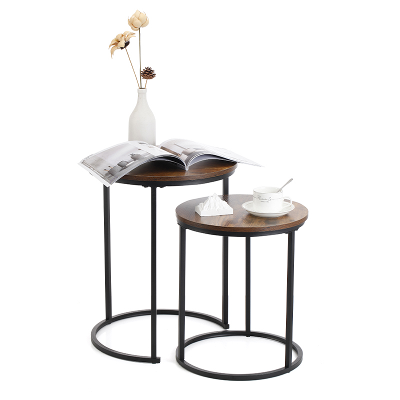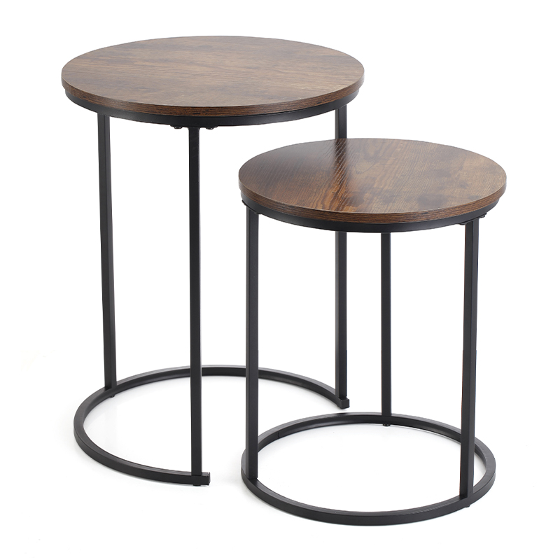Set de mesas auxiliares de diseño moderno e industrial. Combinan una estructura metálica con superficies de acabado natural que aportan calidez y elegancia al espacio. Perfectas para sala, dormitorio o área de lectura.