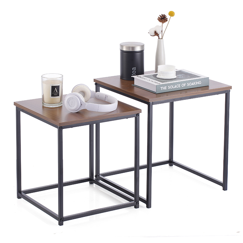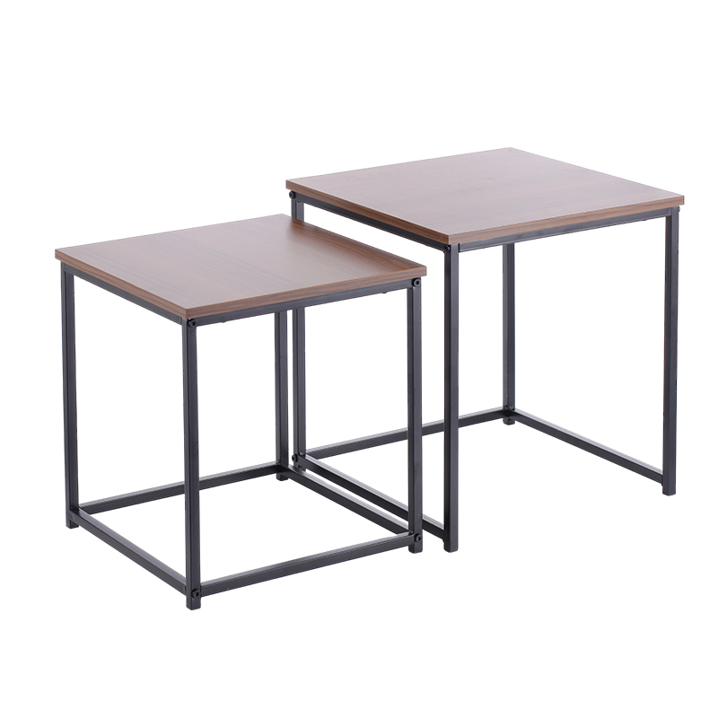 Set de mesas auxiliares con estructura metálica y superficies de acabado tipo madera. Su diseño cuadrado y moderno aporta funcionalidad y estilo, adaptándose fácilmente a diferentes ambientes del hogar.