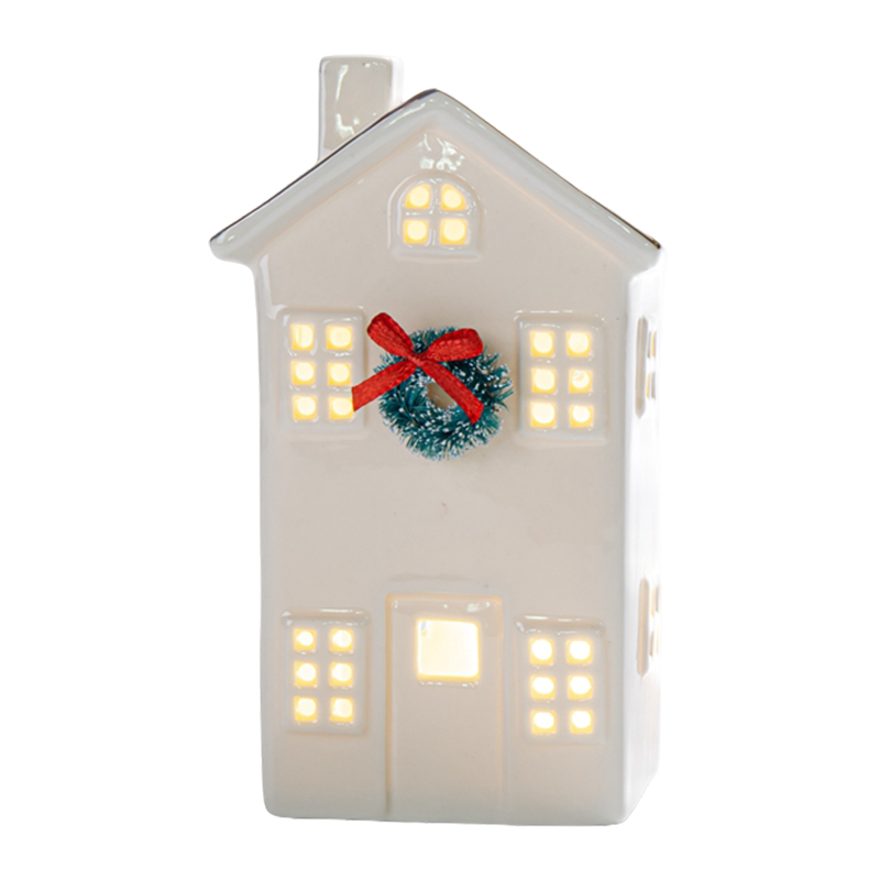Este hermoso adorno navideño con forma de casa iluminada es perfecto para añadir un toque cálido y festivo a cualquier espacio. Elaborado en cerámica con acabado brillante, presenta una encantadora casita decorada con una corona verde y un lazo rojo, detalle que resalta su espíritu navideño. Sus ventanas caladas permiten que una luz cálida brille desde el interior, creando un ambiente acogedor ideal para mesas, repisas, entradas o vitrinas.