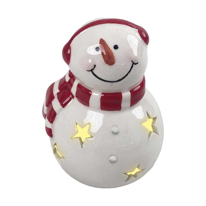Añade un toque dulce y festivo a tu decoración con este encantador muñeco de nieve decorativo. Elaborado en cerámica con acabado brillante, presenta un diseño tierno con bufanda y gorro rojo, acompañado de delicados detalles que transmiten calidez y alegría. Sus estrellas caladas permiten que la luz interior brille suavemente, creando un efecto acogedor perfecto para ambientar salas, entradas, repisas o cualquier rincón navideño.