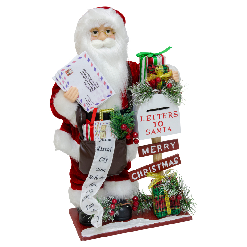 Sujeta una carta para Santa y se acompaña de un buzón con letrero “Merry Christmas”, regalos y detalles festivos que transmiten la ilusión de la Navidad. Perfecto para ambientar entradas, mesas o espacios especiales.