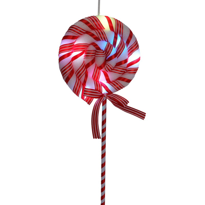 Chupete decorativo con diseño navideño en espiral y luz LED integrada, perfecto para realzar la decoración de temporada con un detalle llamativo y original.