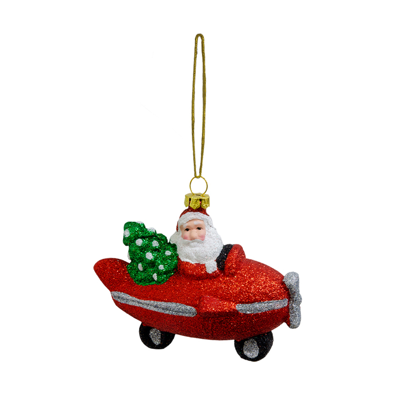 Dale un toque divertido y original a tu árbol con este adorno de Santa Claus pilotando un avión rojo. Con detalles brillantes y un pequeño árbol a bordo, este diseño encantador añade alegría y creatividad a tu decoración navideña.