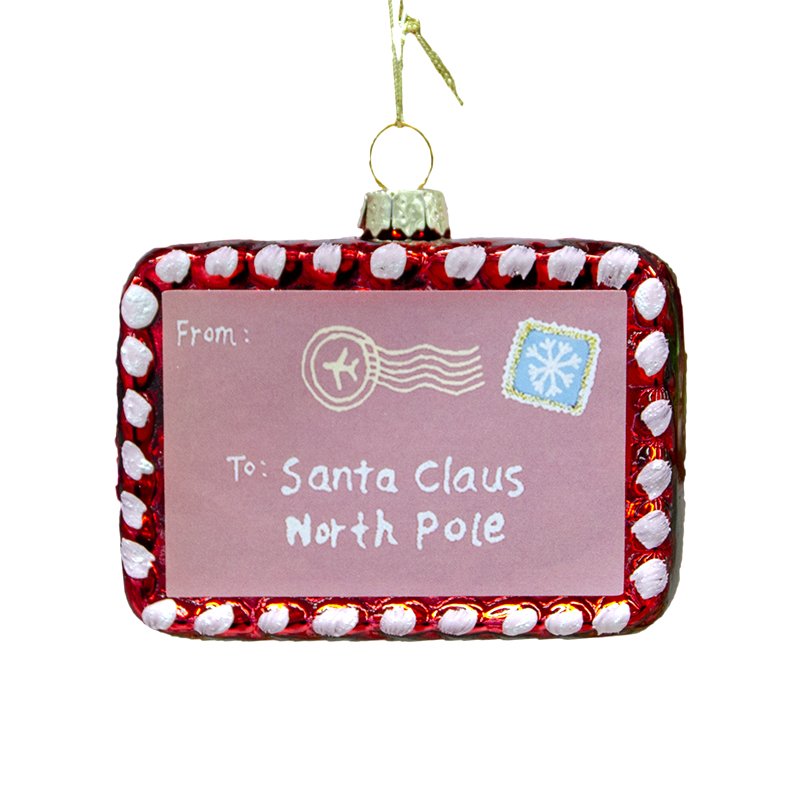 Original adorno en forma de carta con borde rojo y blanco, decorado con la inscripción “To: Santa Claus North Pole”. Perfecto para dar un toque divertido y lleno de ilusión a tu árbol navideño.
