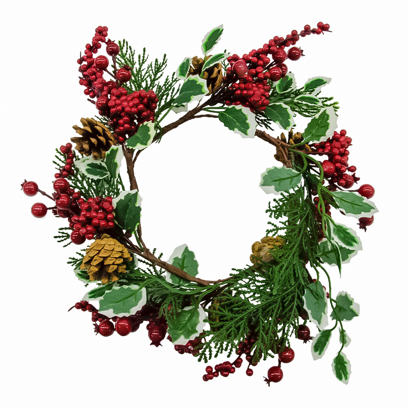 Corona navideña decorativa con follaje, piñas y frutos artificiales, perfecta para dar la bienvenida a la temporada festiva. Su diseño natural y elegante la convierte en un detalle encantador para puertas, paredes o mesas.