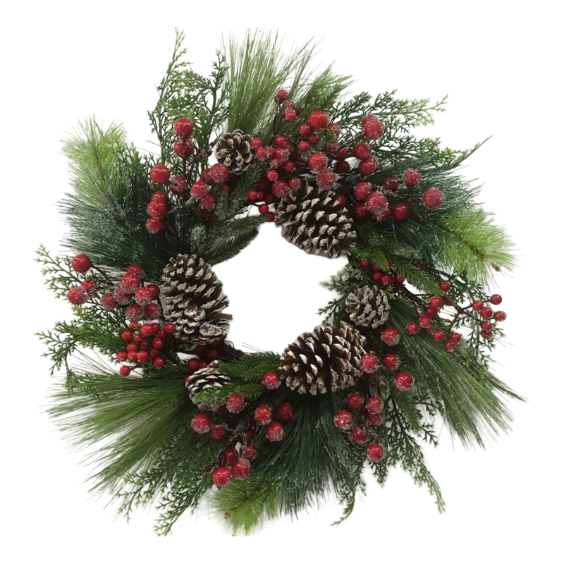 Decora tu hogar con estilo tradicional y natural gracias a esta corona navideña. Con un diseño que combina ramas verdes, piñas y frutos rojos, es ideal para colocar en puertas, paredes o ventanas, llenando cualquier espacio de un encanto festivo y acogedor.