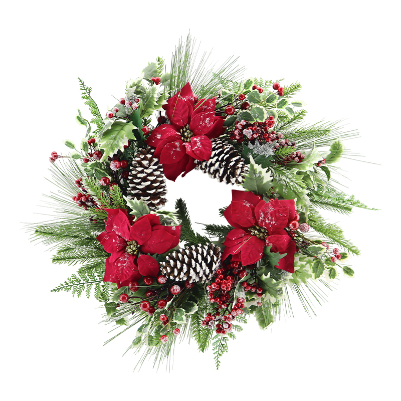 Corona decorativa con flores de nochebuena, piñas nevadas y ramas verdes.