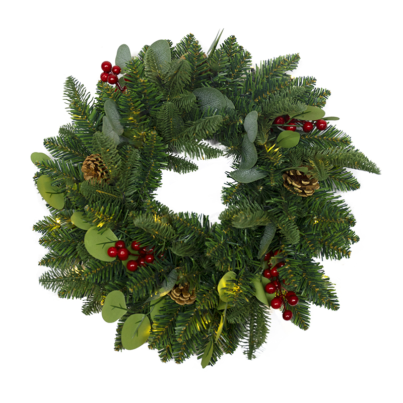 Corona con detalles de cerezos y piñones ideal para la decoración navideña.