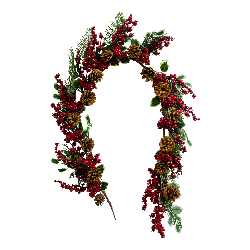 Guirnalda decorativa con piñas, follaje verde y bayas rojas.