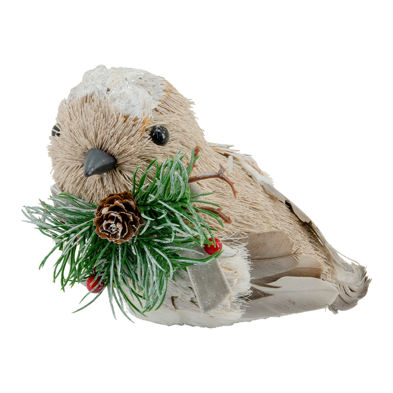 Dale un aire natural y encantador a tu decoración con este delicado pajarito navideño. Confeccionado con un acabado rústico y detalles realistas, sostiene una ramita con piña y frutos rojos que evocan la calidez de la temporada. Ideal para complementar el árbol de Navidad, centros de mesa o rincones especiales del hogar.
