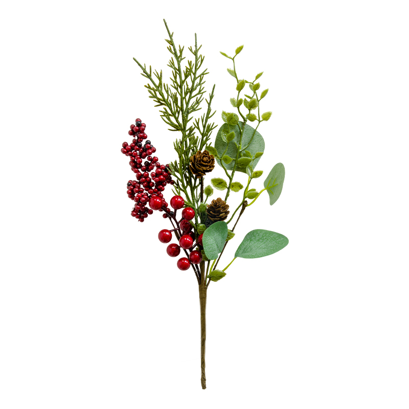 Decora tu hogar con el encanto natural de esta rama navideña. Con hojas verdes, piñas pequeñas y bayas rojas, es perfecta para complementar coronas, centros de mesa, arreglos florales o simplemente para darle un aire festivo a cualquier rincón.