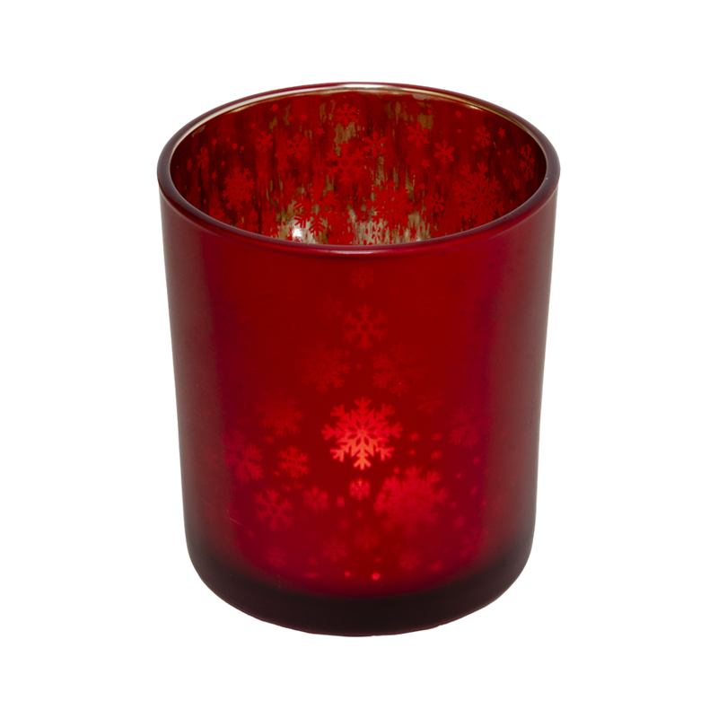 Ilumina tus espacios con el cálido resplandor de este portavelas de vidrio rojo decorado con delicados copos de nieve. Su diseño elegante y festivo crea un ambiente acogedor y navideño, ideal para mesas, repisas o como parte de tu decoración central.