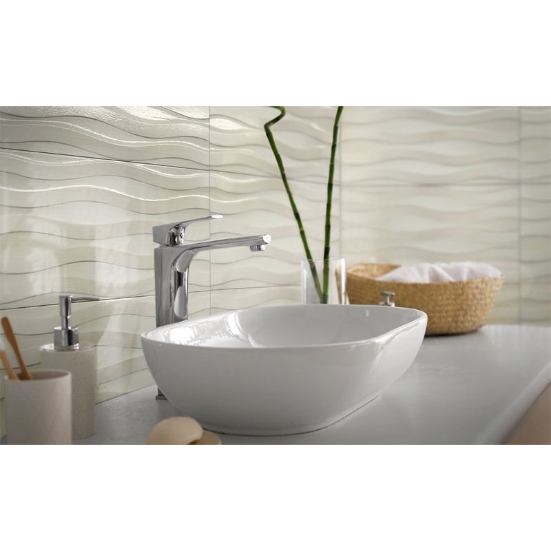 Cerámica decorativa con diseño de ondas en relieve, ideal para dar dinamismo y estilo moderno a paredes interiores de baños, cocinas o áreas destacadas.