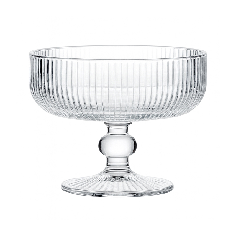 Esta elegante copa para helado está fabricada en vidrio transparente de alta calidad y presenta un diseño acanalado que aporta un estilo clásico y sofisticado. Su amplia capacidad y base elevada permiten una presentación atractiva de postres, realzando la experiencia al servir helados, frutas o preparaciones dulces.