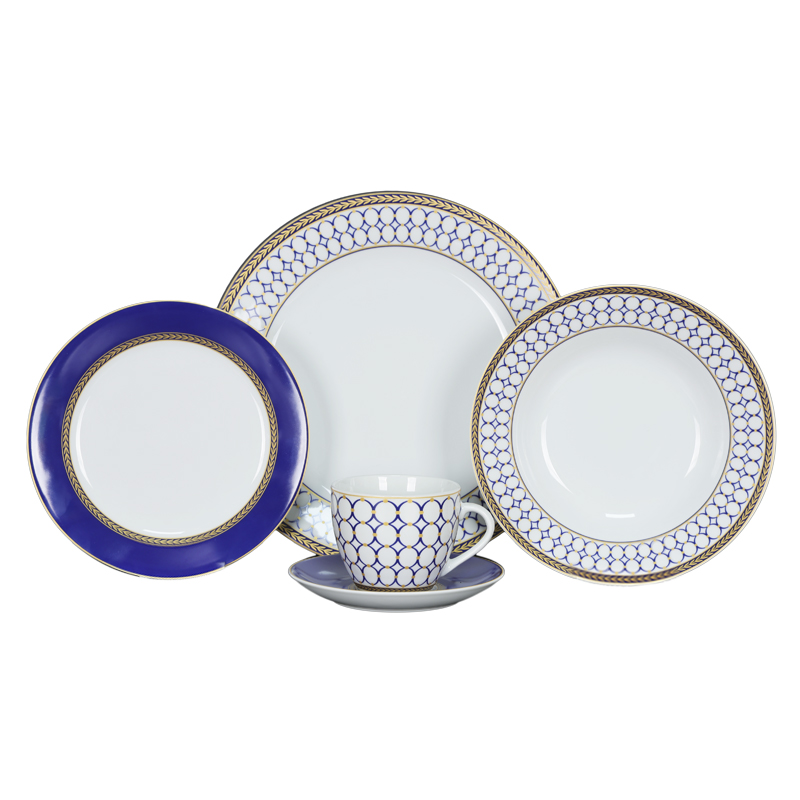 Aporta distinción y elegancia a tu mesa con esta vajilla de porcelana finamente decorada. Su diseño combina un delicado patrón geométrico en azul con detalles dorados que resaltan cada pieza, ofreciendo un estilo clásico y sofisticado ideal para celebraciones especiales o para dar un toque refinado a las comidas diarias.